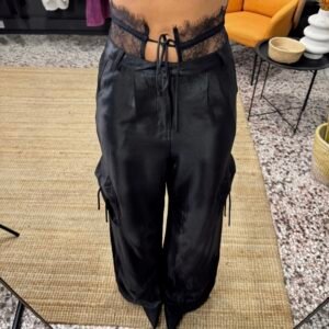 Statement cargo παντελόνι σε γυαλιστερή satin υφή με wide leg γραμμή και ιδιαίτερη λεπτομέρεια δαντέλας στη μέση. Διαθέτει κορδόνι ρύθμισης και πλαϊνές cargo τσέπες με δεσίματα στο τελείωμα. Θηλυκό αλλά δυναμικό, ιδανικό για elevated street looks και βραδινά σύνολα με fashion χαρακτήρα. Το μοντέλο φοράει Μ με ύψος 170 cm.