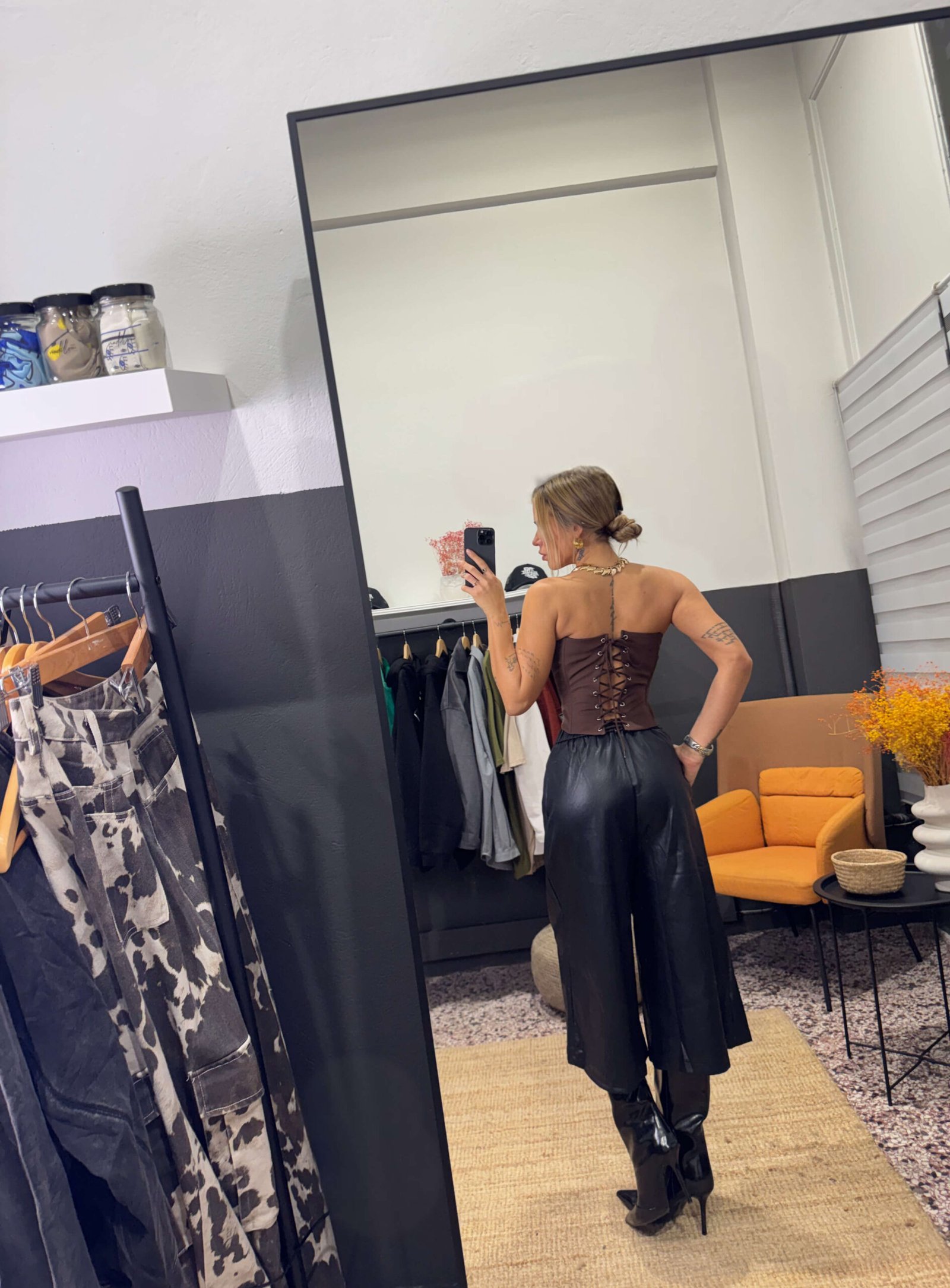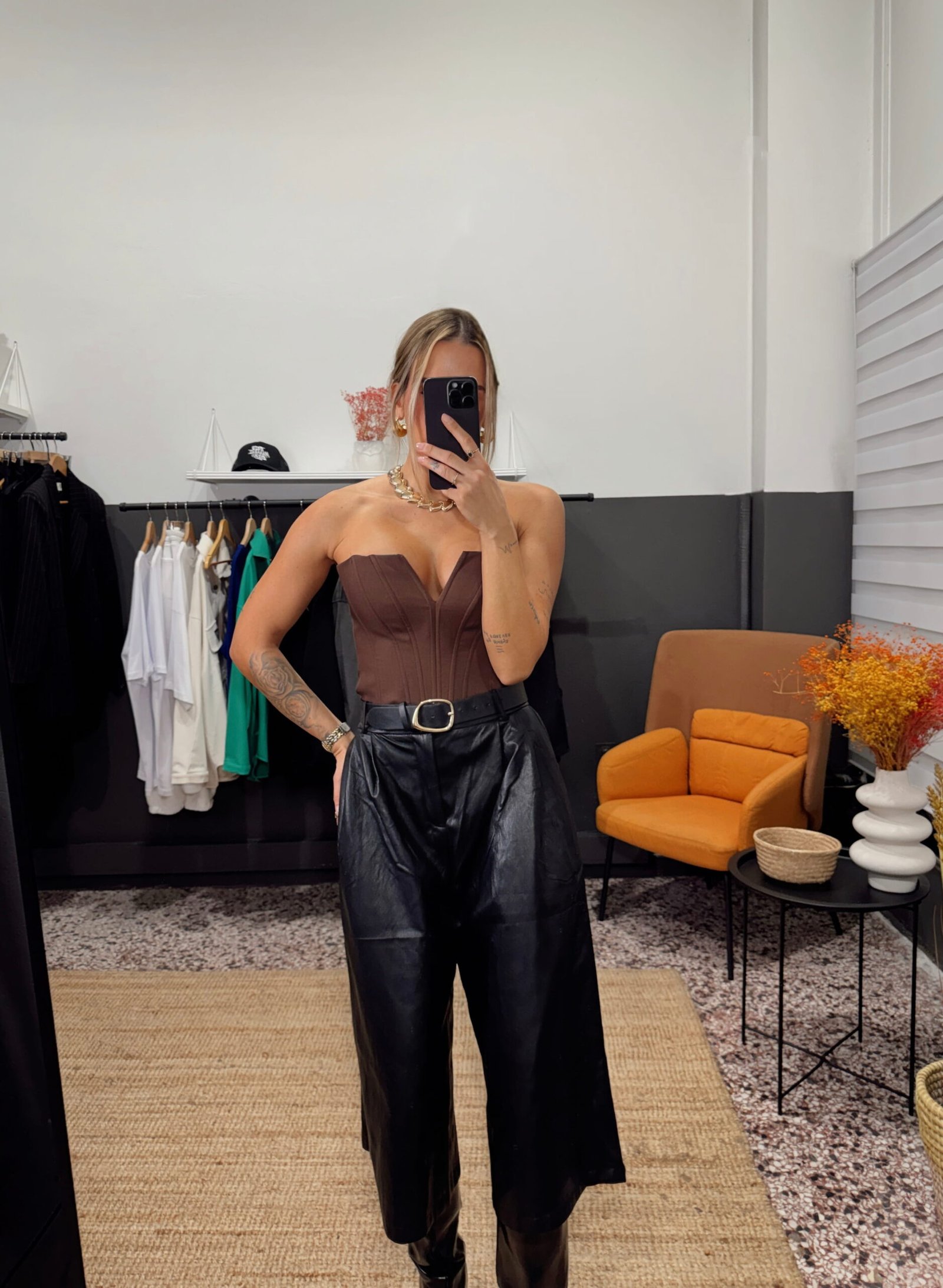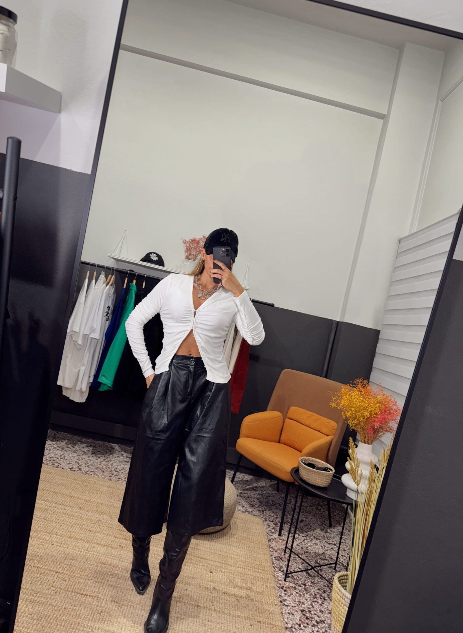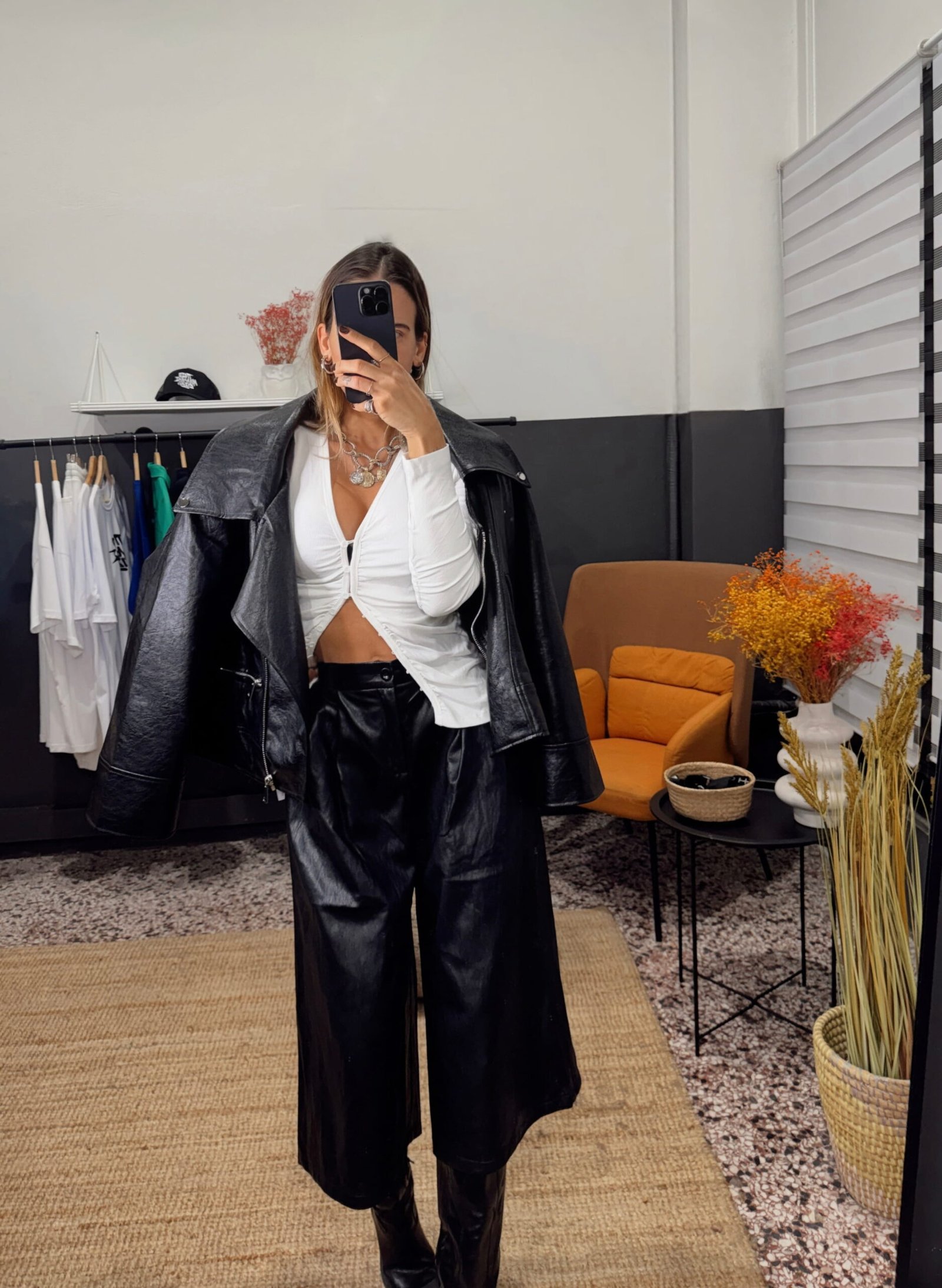 Ψηλόμεση εφαρμογή. Ύφασμα faux leather(όψη δέρματος). Φαρδιά άνετη γραμμή. Μαλακή υφή με δομημένη εμφάνιση. Εύκολη στο styling για εμφανίσεις από το πρωί έως το βράδυ.Το μοντέλο φοράει μέγεθος S με ύψος 170 cm