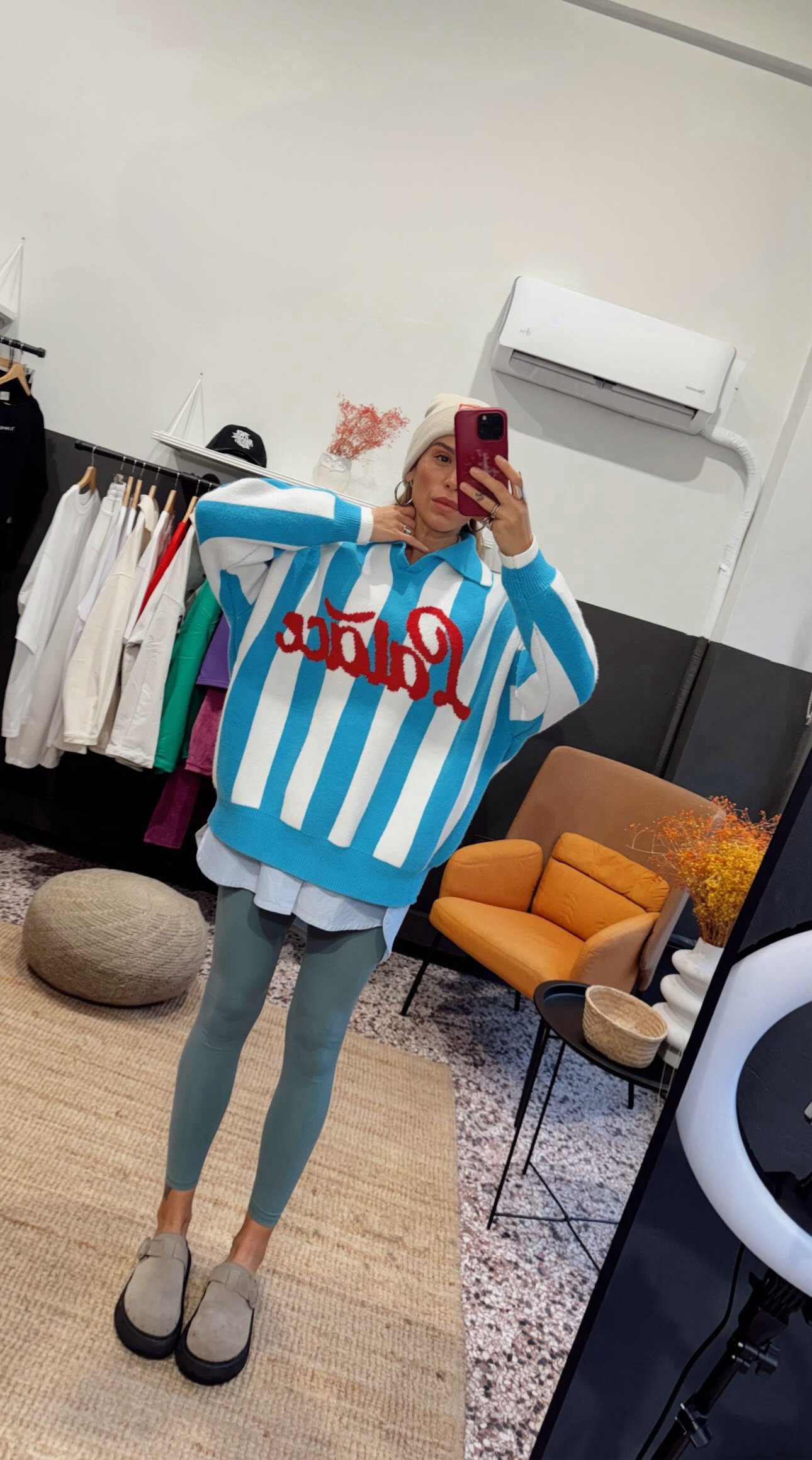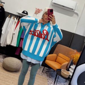 Oversized πλεκτο με ριγες σε γαλαζιο και λευκο με statement κοκκινα γραμματα στο μπροστινο μερος.