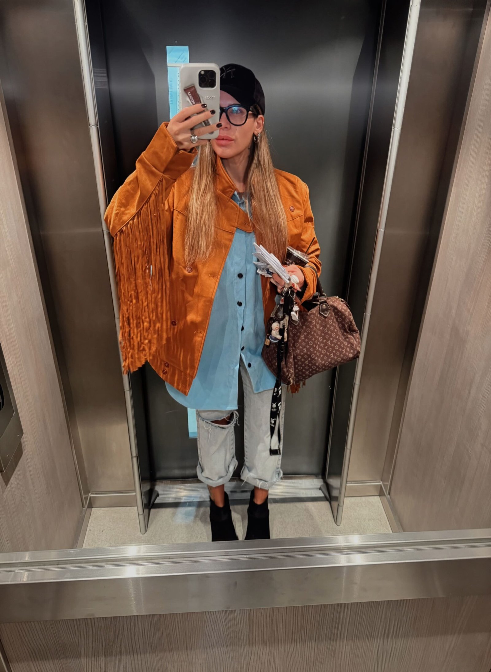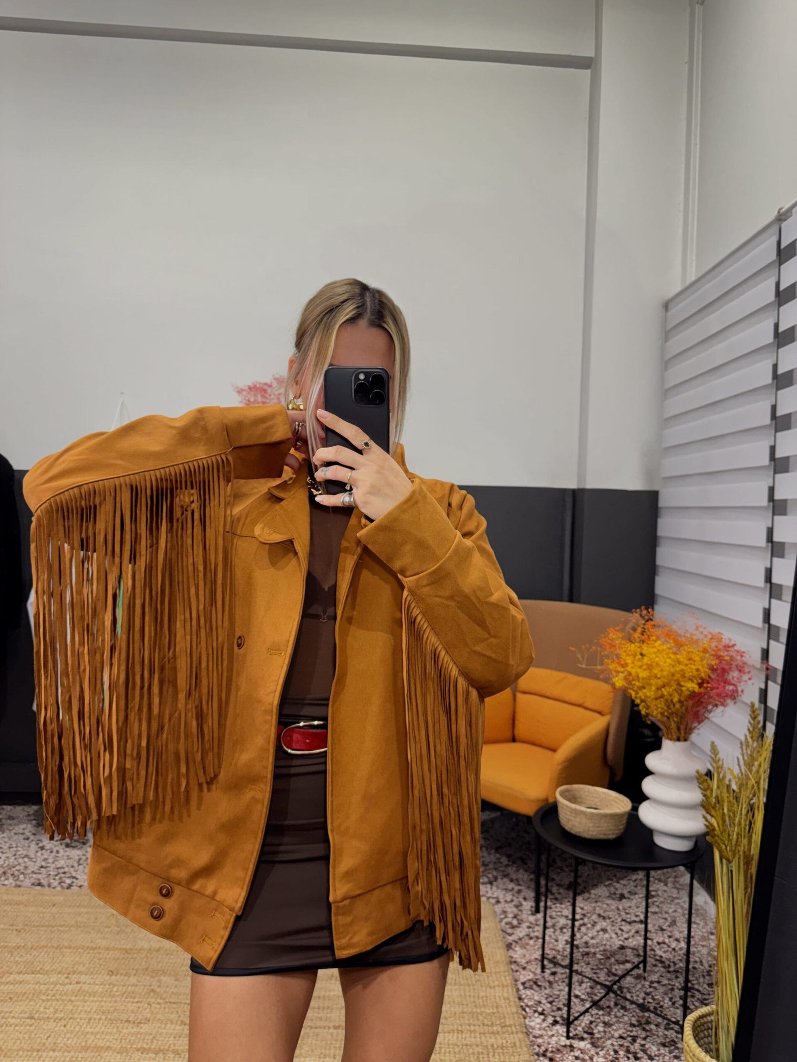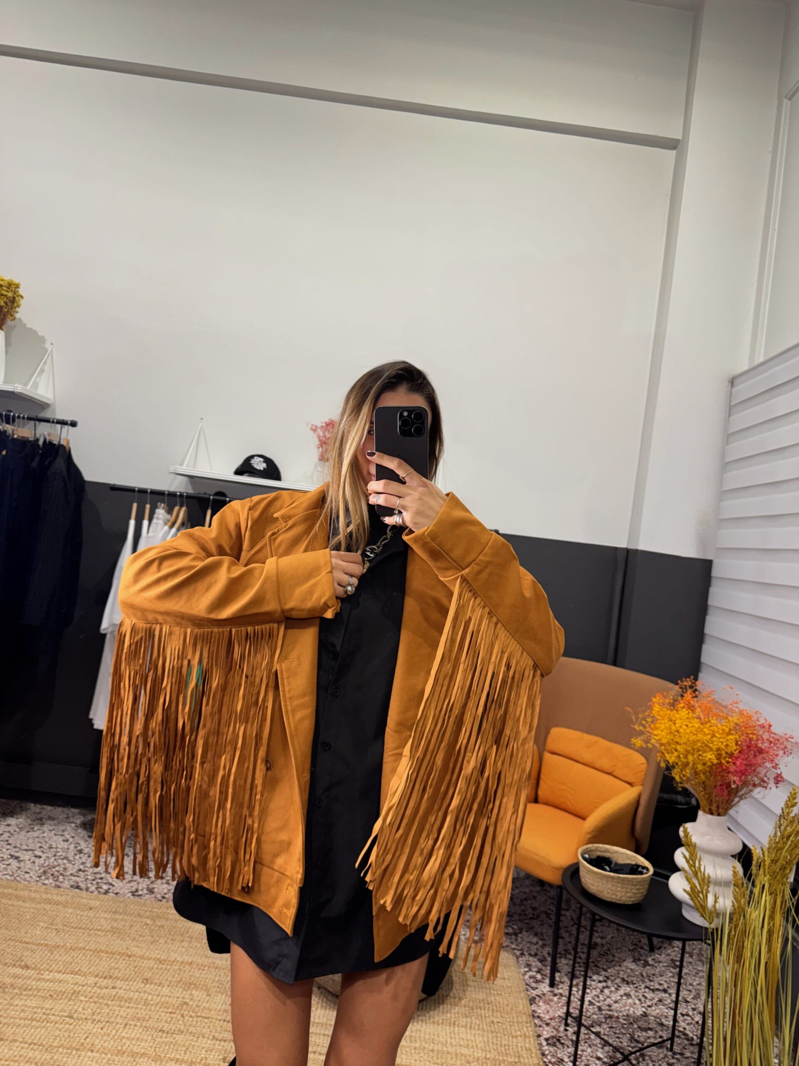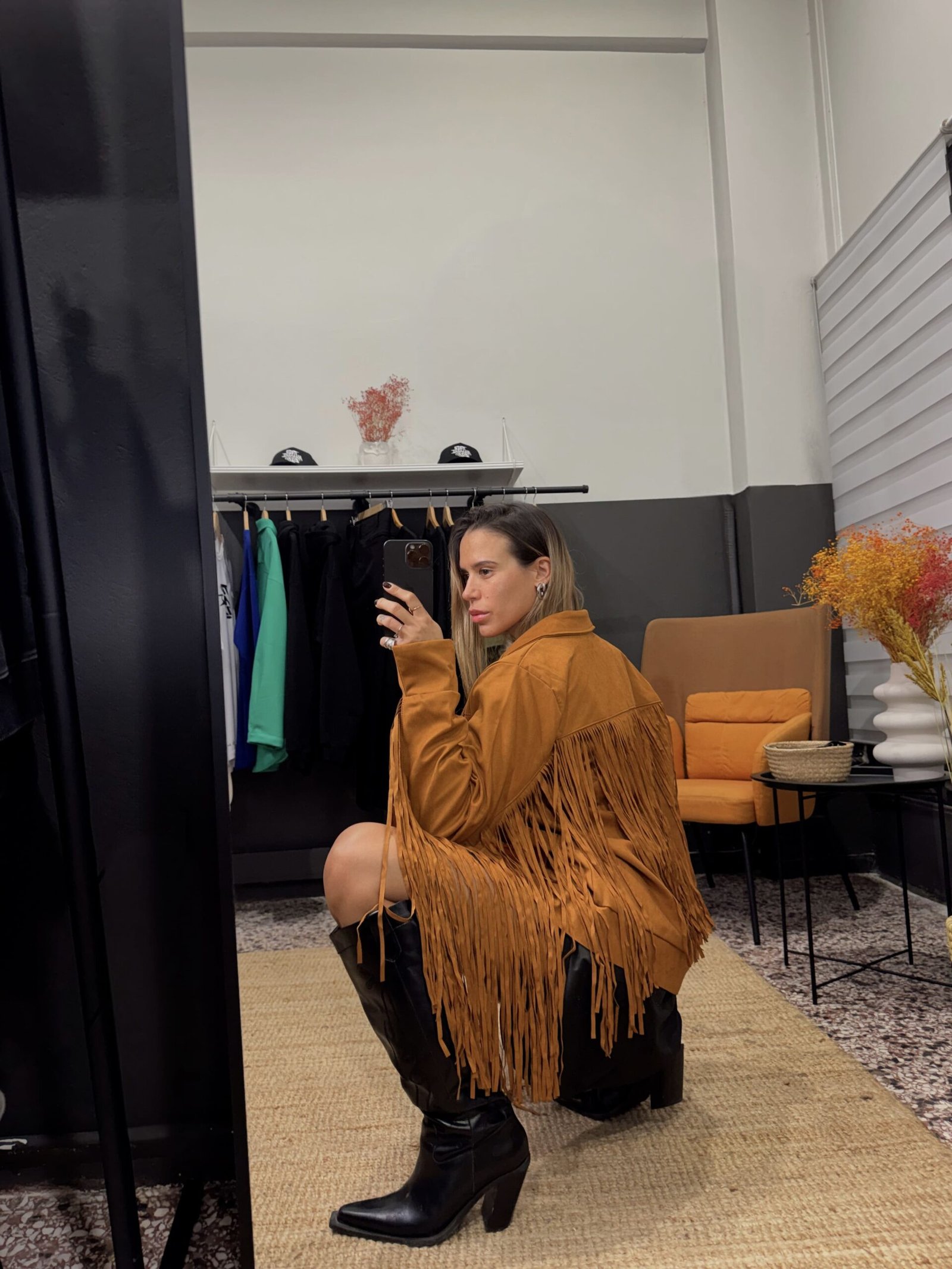 Jacket από suede υφή με εντυπωσιακά κρόσσια στα μανίκια και στην πλάτη,που χαρίζουν έντονο western χαρακτήρα και κίνηση. Διαθέτει άνετη, χαλαρή εφαρμογή και φοριέται εύκολα από το πρωί έως το βράδυ.Ένα statement κομμάτι που αναβαθμίζει κάθε outfit ,από casual έως πιο fashion εμφανίσεις