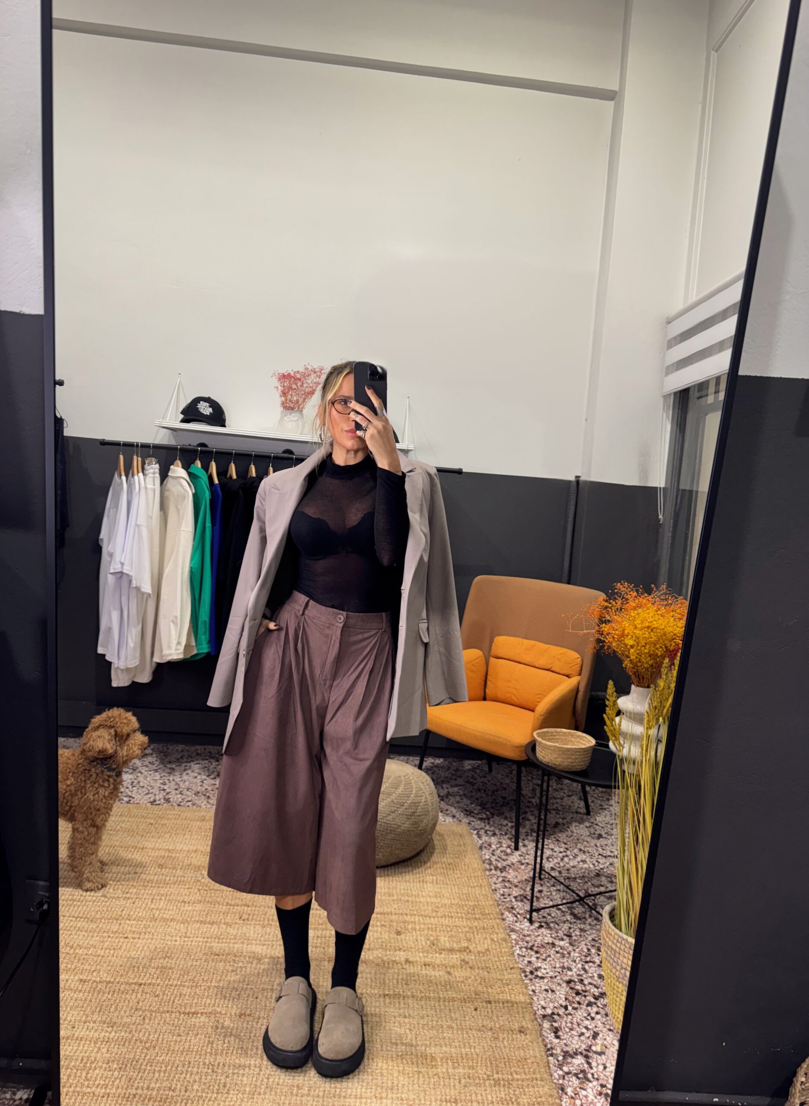 Ψηλόμεση εφαρμογή. Suede ύφασμα σε απαλή υφή. Φαρδιά, άνετη γραμμή.Casual αλλά κομψό ύφος. Ιδανική για καθημερινές και πιο refined εμφανίσεις. Το μοντέλο φοράει μέγεθος S με ύψος 170 cm
